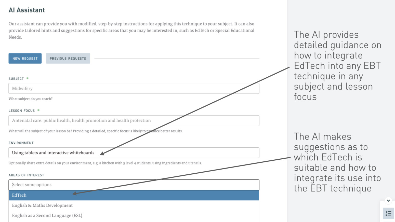 The HOW2 AI Assistant helps teachers make sense of how to use EdTech in their own teaching — guiding them through how to connect tools to specific, evidence-based techniques that align with their subject, lesson focus, and learners.