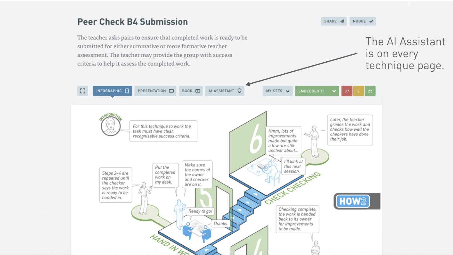Technological Knowledge: The integrated HOW2 AI Assistant builds on this foundation. It shows where and how technology can enhance and support specific teaching strategies — helping educators use EdTech tools within the lesson sequence, subject and topic focus, and learner needs. Its latest EdTech feature identifies opportunities where digital tools can strengthen evidence-based techniques, suggesting ways to embed them seamlessly into teaching workflows. Notably, the HOW2 AI Assistant ensures that technology remains a natural extension of great pedagogy, not an add-on.